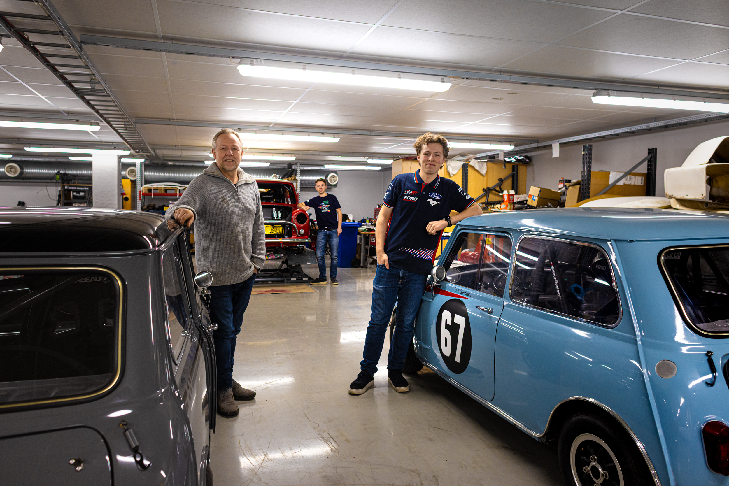 I ReFUEL-sponsede Historisk Racing skal både far og begge arvingene kjøre hver sin Mini Cooper fra 60-tallet. I utgangspunktet tre nesten identiske biler. Bilene er suksessivt 1963, ‘64 og ‘65-modeller med 1293cc motorer og homologert vekt på skarve 620 kg. De er så like som de får blitt, men med små forskjeller på motor og finish. På bilen til pappa-Gjerdrum ryktes det om noen forskjeller på motor, men også litt høyere vekt på grunn av sparkel under lakken og strøken finish. Men det er Mads som har erfaring bak rattet på disse små engelskmennene, blant annet på Goodwood Revival og i NM. Det blir spennende å se om de yngste henger med, eller om talent trumfer erfaring.