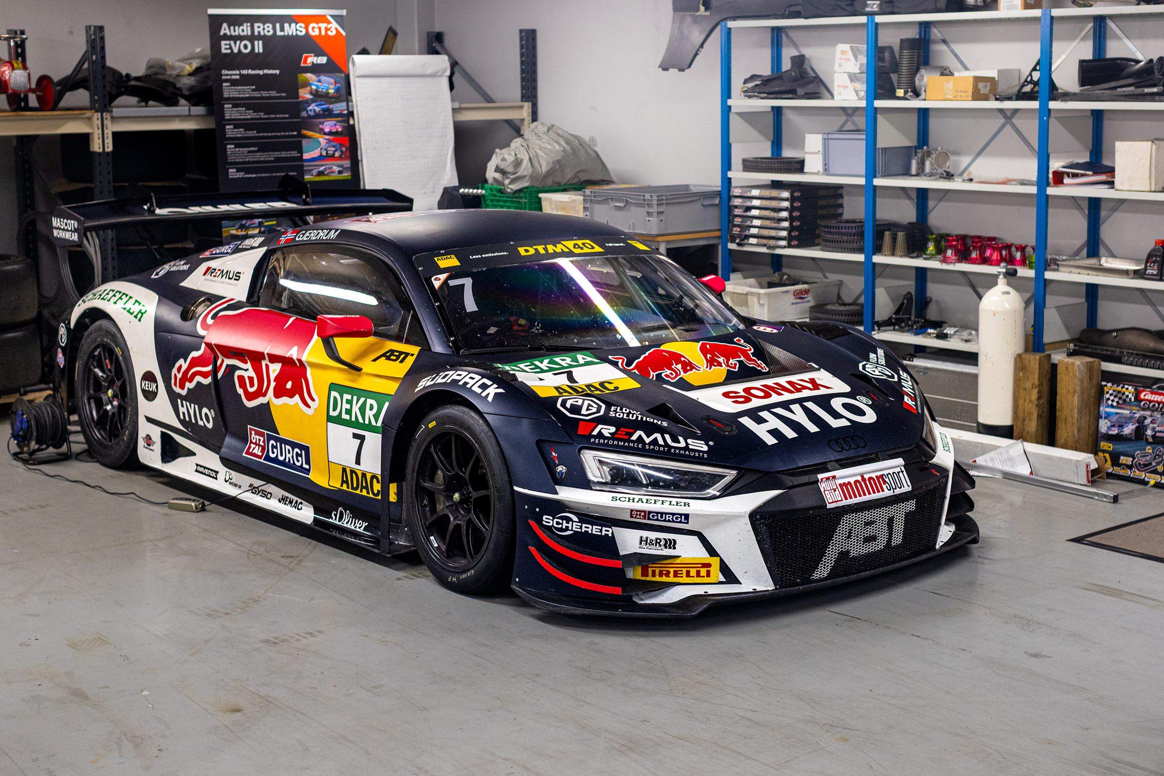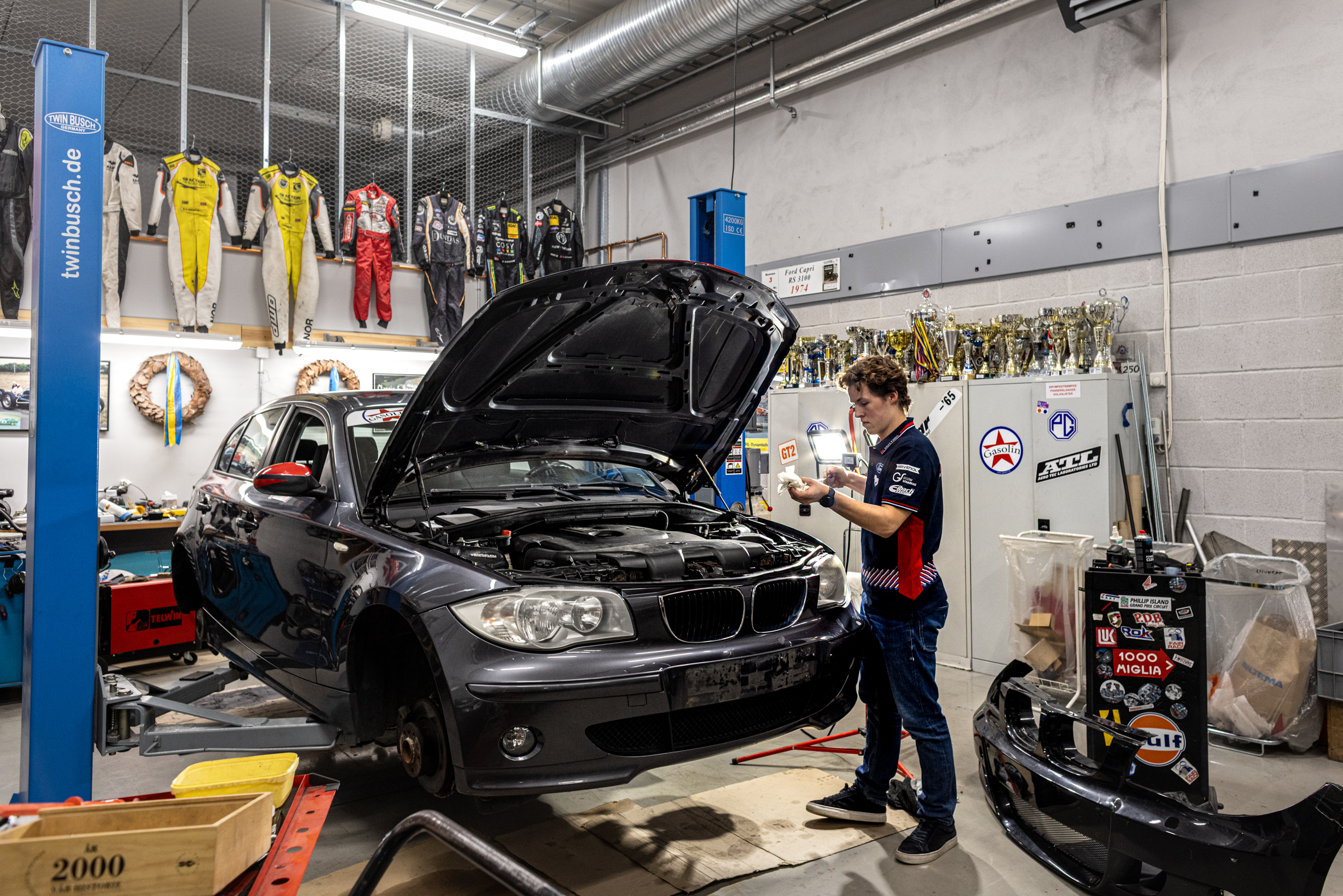 På verkstedet står det mye forskjellig. Her finner vi eksempelvis Audi R8 FIA GT3-bilen Emil kjører med her i Norge, en BMW 1-serie isbil, nye og gamle gokarter han har kjørt med i løp og flere prosjekter han og familien jobber med.